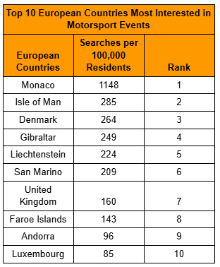 “Monaco, Isle of Man, and Denmark are setting the pace in motorsport interest, with search activity that far outstrips the European average.